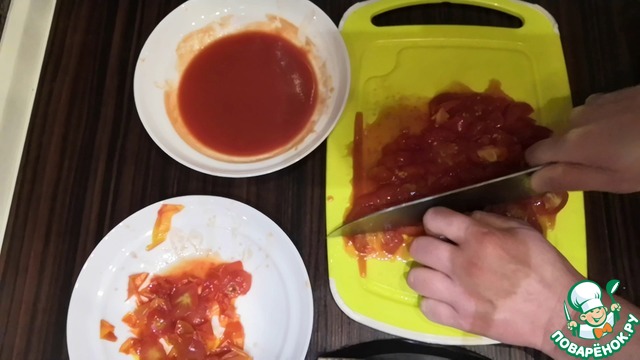Томаты очищаем от кожицы, нарезаем кубиком.