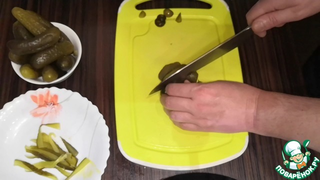 Через пару минут добавляем в кастрюлю огурцы. Следом Добавляем маслины. И столовую ложку каперсов.