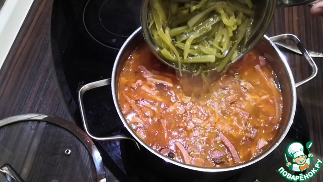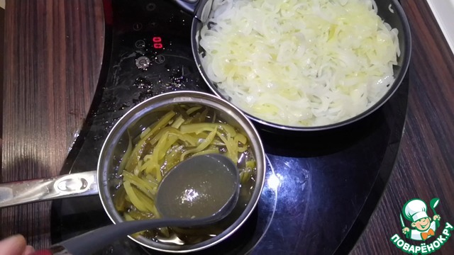 В сотейник отправляем огурцы и добавляем 2 половника бульона. Варим 5 минут на среднем огне.