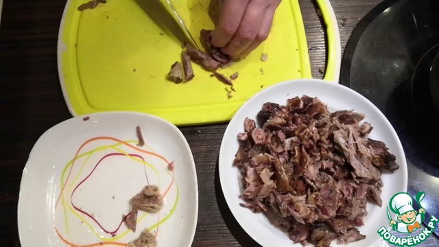 Через два с половиной часа извлекаем мясо и ребра. Даем им немного остыть.