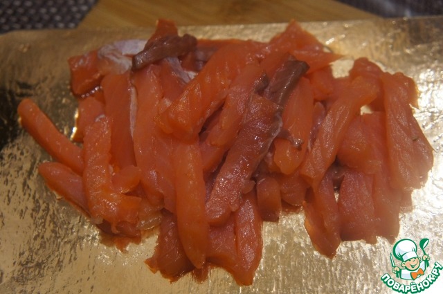Семгу срезать с кожи, аккуратно удалить все косточки. нарезать брусочками.