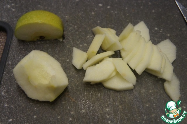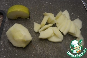 Яблоко очистить от кожицы и семеной коробочки, нарезать соломкой, сбрызнуть 1 ст. л. лимонного сока и осторожно перемешать.