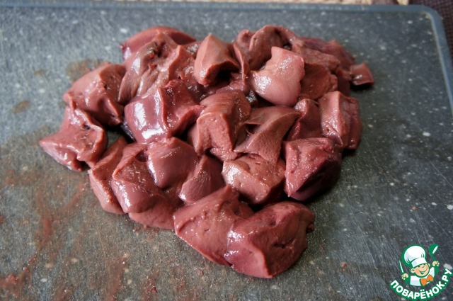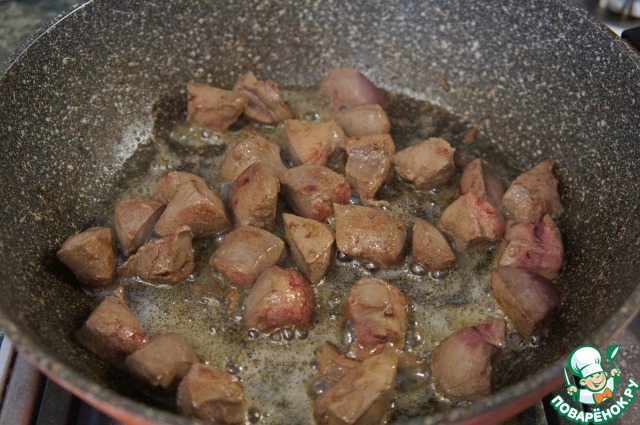 На сковороде растопить сливочное масло, затем добавить растительное. Обжарить печень (но 4-5 кусочков оставить для гарнира).