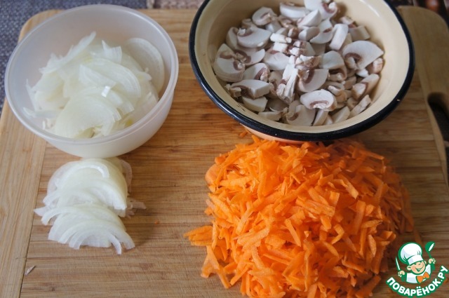 Нарезать полукольцами 2 средних луковицы. Грибы измельчить. Крупно натереть морковь.