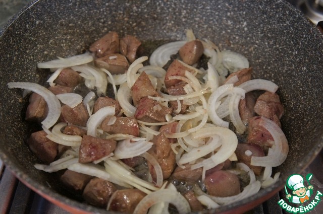 Когда печень поменяет цвет, добавить лук, довести до мягкости.