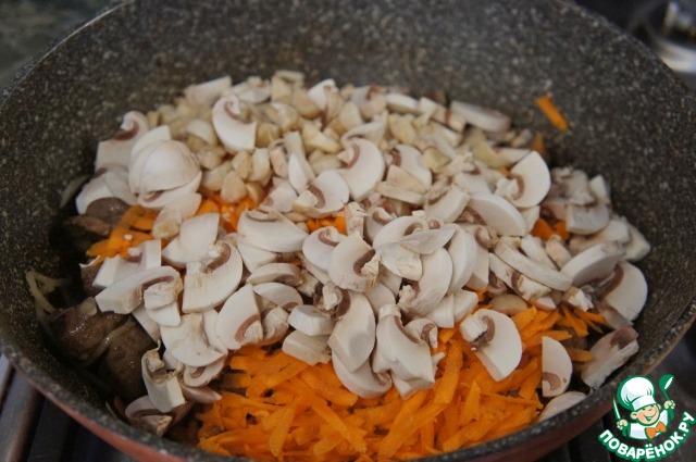 Затем добавить грибы с морковкой. Тушить 2-3 минуты.