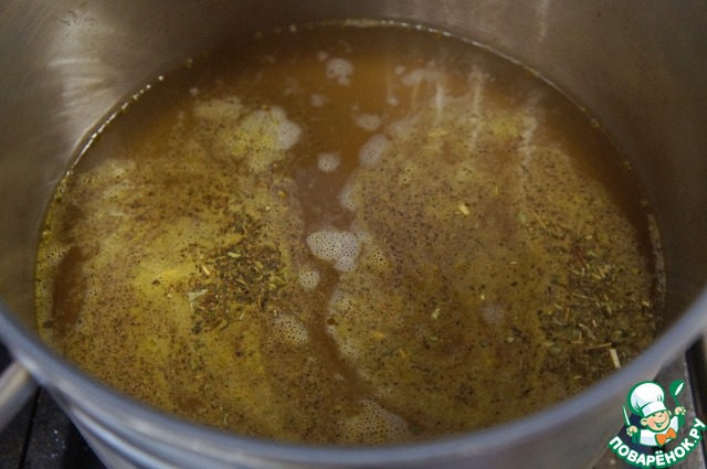 Нагреть в кастрюле мясной или овощной бульон. Посолить, поперчить, добавить сахар. Потом добавить чабер и эстрагон.