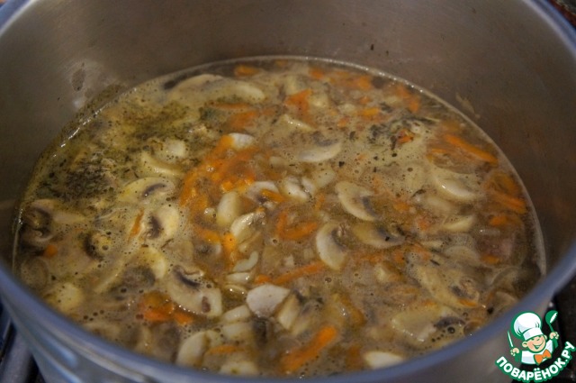 Положить в бульон смесь из печени, овощей и грибов и варить 20 мин.