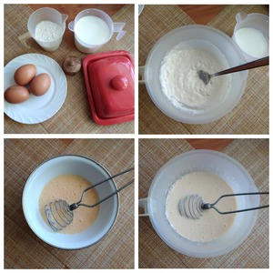 Готовим всё, что нам понадобится для блинов. Молоко разбавляем тёплой водой в равных долях. В посуду, где будем замешивать тесто, помещаем муку. Наливаем в неё половину смеси молока с водой, соединяем. В другой посуде подвзбиваем яйца с солью. Отправляем к мучной смеси. Соединяем.