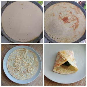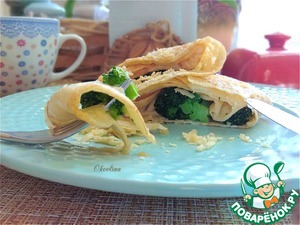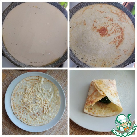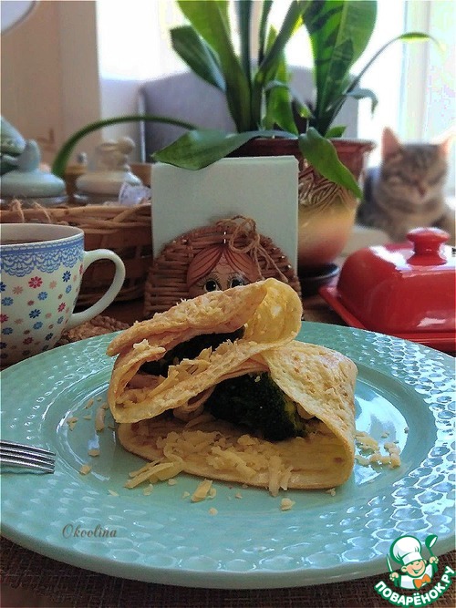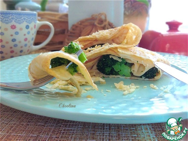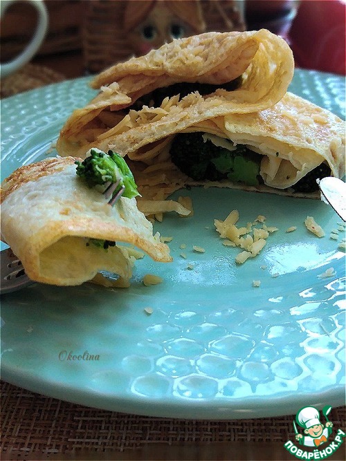 ... наливаем тесто очень тонким слоем. Блин быстро схватится. Легко его перевернём. Снимаем на тарелку и присыпаем сыром, выкладываем брокколи и сворачиваем. Перекладываем сразу на тарелку для подачи. Так поступаем с каждым блином. У меня сковорода D-24 см и у меня из этого теста получилось 6 шт блинов. По 2 шт на порцию. Если вы будите использовать сыр, который будите намазывать на блины, то блины выпеките сначала все, и чтобы они не остыли быстро после снятия со сковороды, накрывайте снятые блины колпаком (крышкой).
