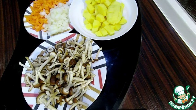 Тем временем подготавливаем овощи. Морковь, картофель, лук очищаем, промываем и затем нарезаем. Грибы промываем, перебираем, срезаем сросшиеся основания.