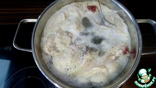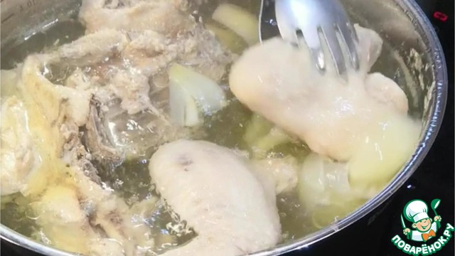 Первым делом курицу отправляем в кастрюлю и заливаем водой, ставим на сильный огонь.