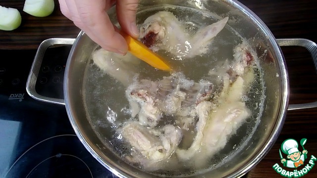 В бульон отправляем одну морковь и луковицу. Убавляем огонь, варим 40-50 минут.