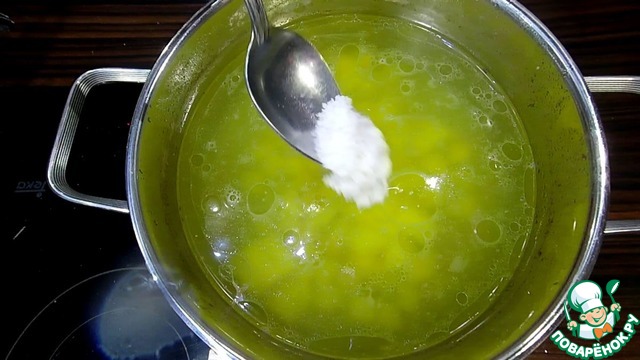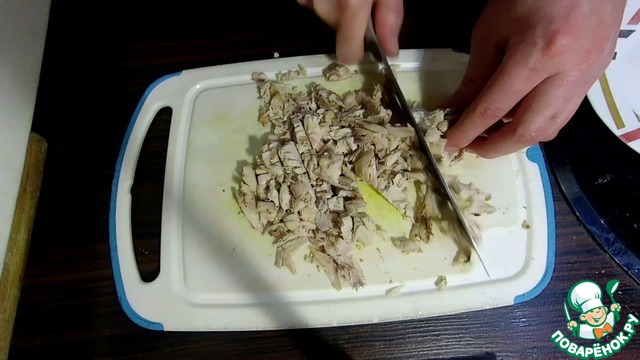 Нам осталось только добавить зелень. Нарезаем и отправляем в кастрюлю.