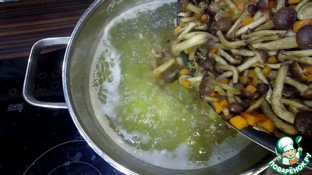 Грибы готовы, их тоже отправляем в кастрюлю.