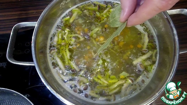 Добавляем лавровый лист. Даем покипеть 5 минут на умеренном огне.