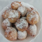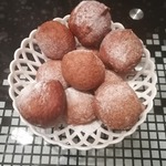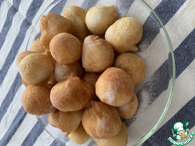 3. Готовые пончики перекладываю на бумажное полотенце. А когда остынут, посыпаю сахарной пудрой.