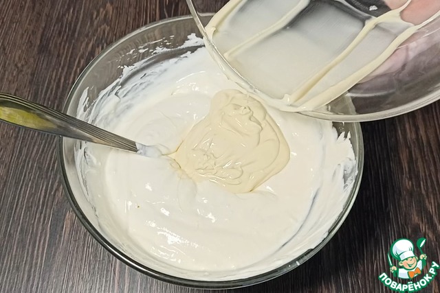 Плитку белого шоколада растапливаю на водяной бане и добавляю к крему. Перемешиваю до однородности.