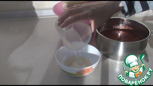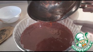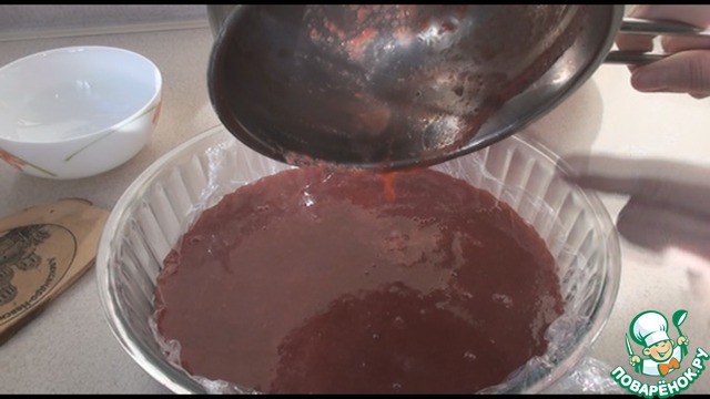 В горячее пюре выкладываем набухший желатин и хорошо размешаем, чтобы не было комочков. Выливаем в форму, застеленную пищевой пленкой, чтобы потом было легче отделять желе. Выносим на холод, часа на два, чтоб хорошо застыло. Форму берем меньше в диаметре, чем та в которой будем собирать торт, например торт 26 см, значит для конфи 24 см.