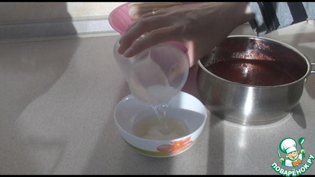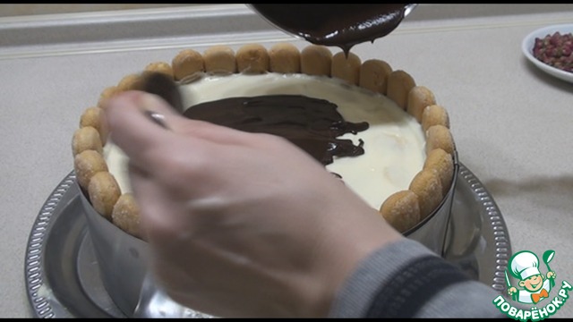 В микроволновой печи растопим шоколад, добавим молоко, размешаем и зальём сверху крема.
