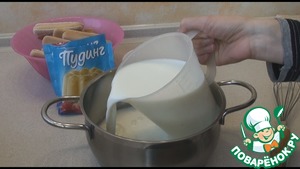 Приготовим заварной крем. В сотейник нальем 800 мл молока, добавим сахар и ставим на огонь, доводим до кипения. Тем временем всыпаем в оставшееся молоко 2 пакетика ванильного пудинга и хорошо размешаем. Если нет пудинга, я написала сколько нужно взять кукурузного крахмала и ванильного сахара, это практически одно и то же.