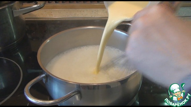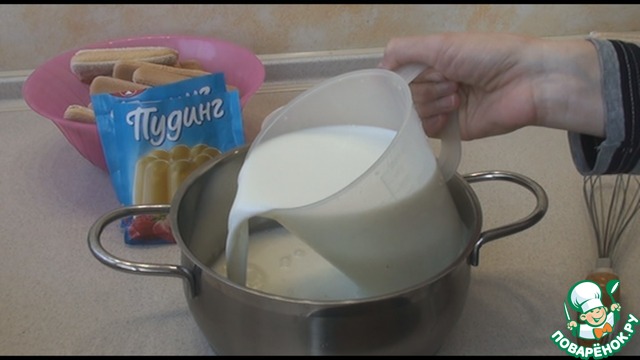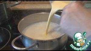 Когда молоко начнет закипать вливаем тонкой струйкой пудинговую смесь и постоянно помешивая, варим до загустения. Это происходит очень быстро, буквально несколько минут. Отставим крем в сторону.