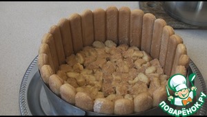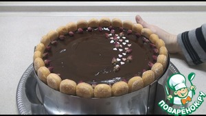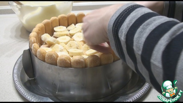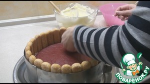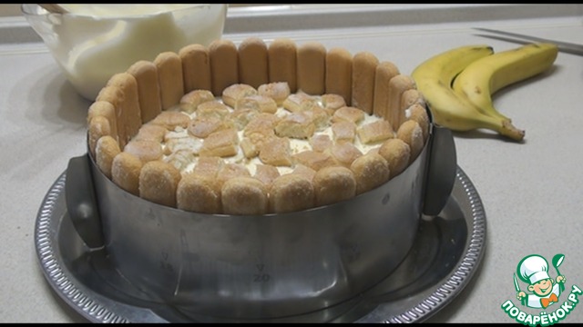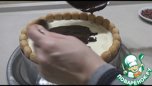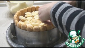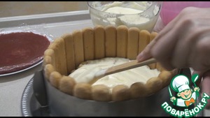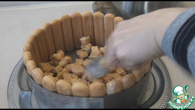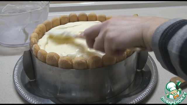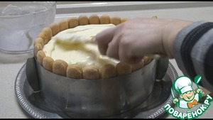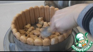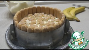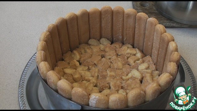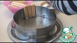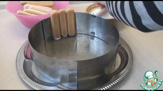 Форма для торта у меня диаметром 26 см. В мисочку нальем молоко. Печенье савоярди окунаем буквально на секунду в молоко и выставляем вдоль формы, формируя бортики.