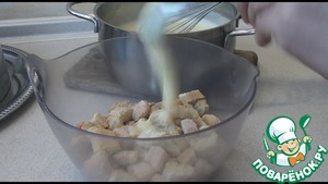 Потом примерно 100-120 грамм печенья поломаем на небольшие кусочки, добавим 5-6 ст л горячего крема и хорошо перемешаем, чтобы крем обволакивал каждый кусочек печенья. Благодаря этому печенье пропитается и будет мягким.