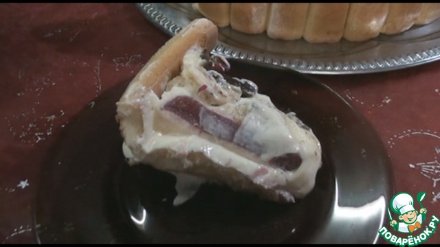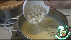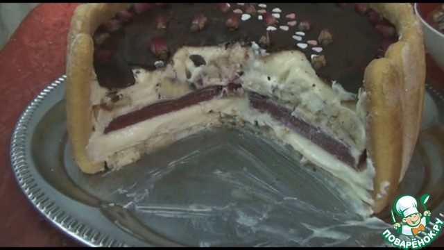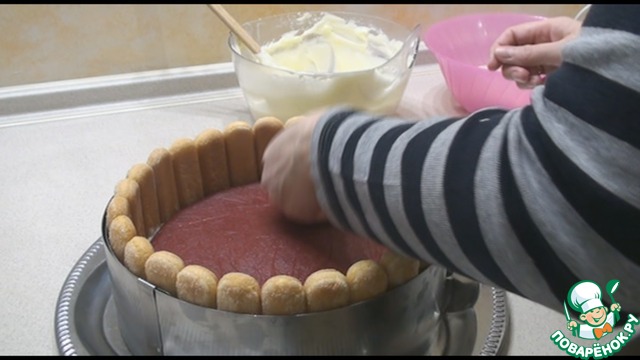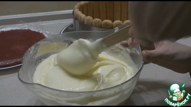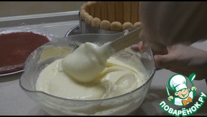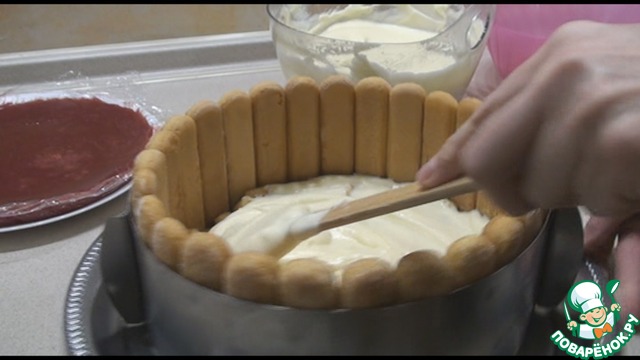 Можно собирать торт. Тут есть два варианта: оставить крем как есть, тогда кусочки торта будут не очень держать форму, так как крем немного жидковат, я так и делала, фото прилагается ниже. Тем не менее всем гостям торт очень понравился и никто не обратил на это внимание. Я все же рекомендую залить 20 гр желатина 50 мл воды, дать набухнуть, растопить на водяной бане и влить в готовый крем и хорошо размешать. И потом приступить к сборке торта. Выкладываем на остывшее печенье 1/3 крема.