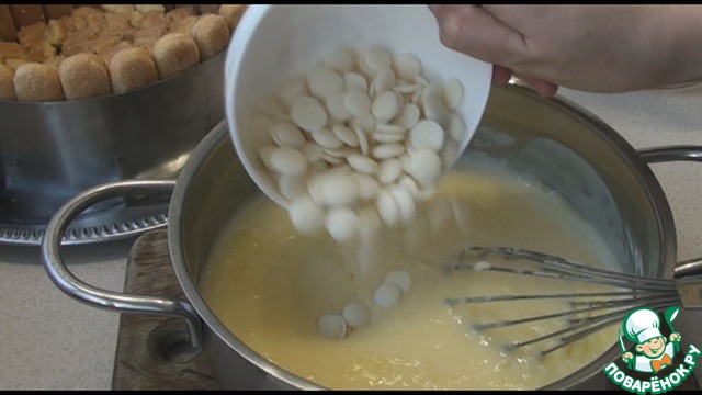 В горячий крем добавляем белый шоколад и хорошо размешаем, чтобы шоколад растворился. Накрываем пищевой пленкой в контакт и даём крему полностью остыть.