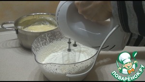 Когда крем остыл берем холодные сливки и хорошо их взобьём, добавим ванильный сахар и буквально 1 ст л сахарной пудры.