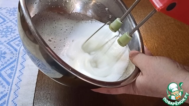 Сначала готовим бисквит. Предварительно белки двух яиц отделяем от желтков. В белки добавляем щепотку соли и начинаем взбивать. Когда белковая масса заметно посветлеет, начинаем порционно добавлять сахар (50 г). Взбиваем до мягких пиков.