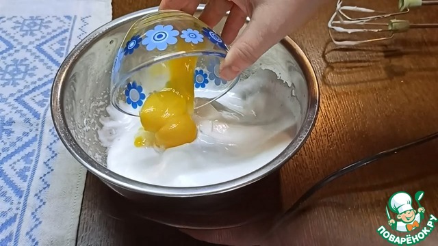 К белкам отправляем желтки и взбиваем ещё 4-5 секунд.