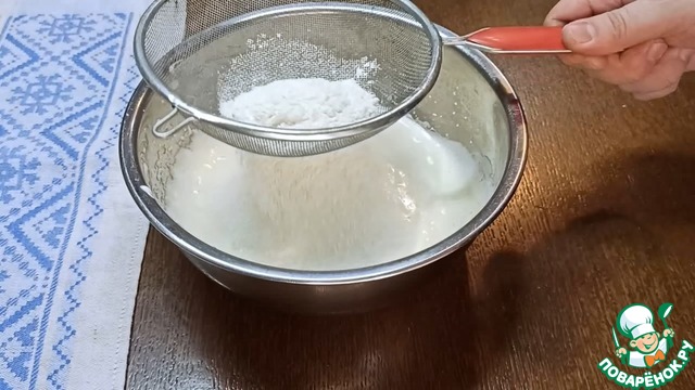 К 80 г пшеничной муки добавляем ½ ч. л. разрыхлителя и порционно просеиваем в яичную массу. Каждый раз аккуратно всё перемешиваем. Комочков с мукой не должно остаться.