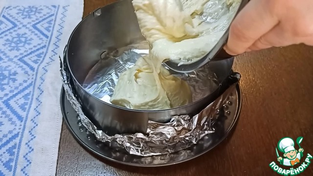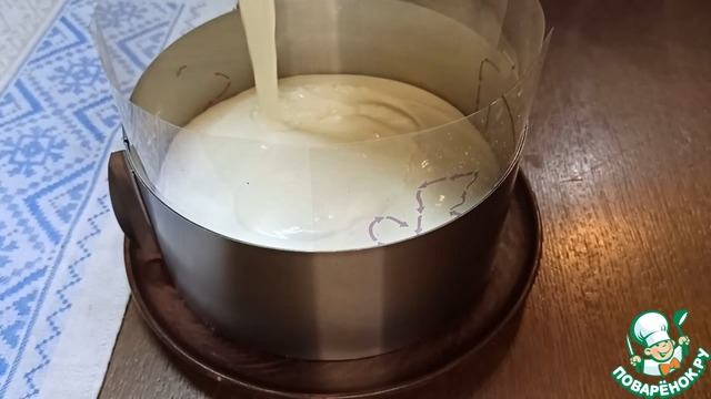 Для сборки тортика воспользуемся тем же кольцом и ацетатной плёнкой. Плотно зажимаем кольцо и выливаем творожную начинку. Отправляем тортик застывать в холодильник минимум на 1,5 часа.