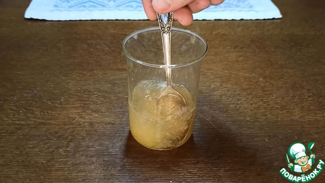 Займёмся начинкой. Предварительно 30 г желатина заливаем 120 мл воды и оставляем набухать. Затем распускаем на водяной бане или в микроволновке короткими импульсами и оставляем остывать до комнатной температуры.