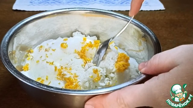 Для приготовления начинки в отдельной миске смешиваем 400 г творога (у меня 9% жирности), 250 г сметаны, 140 г сахара, 1/2 ч. л. ванилина и 1 ст. л. цедры апельсина.