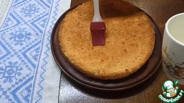 Из духовки достаем бисквит, даем ему немного остыть и вынимаем из формы. Затем, по желанию, бисквит можно пропитать обычным сахарным сиропом или с добавлением апельсинового сока.