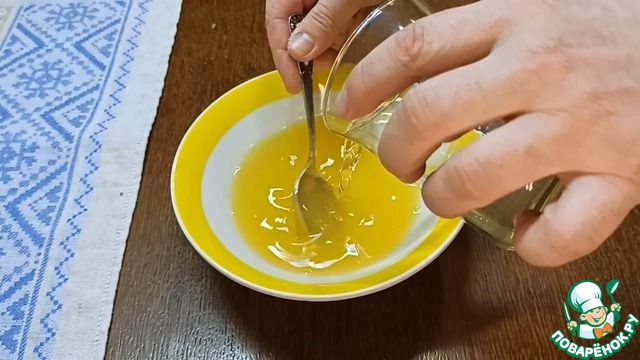 Готовим желе. 15 г желатина смешиваем со 100 мл воды, даем набухнуть, распускаем и остужаем. Смешиваем 150 мл апельсинового сока с распущенным и уже остывшим желатином. Хорошенько перемешиваем.