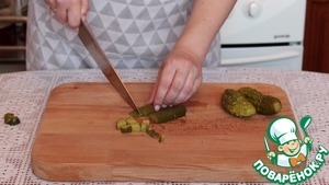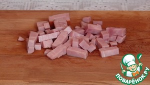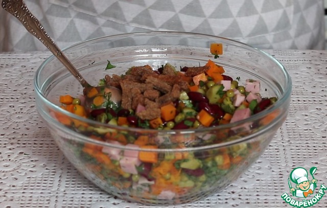 Смешиваем все нарезанные ингредиенты: морковь, ветчина, фасоль, горошек, зелень, огурцы маринованные. Добавляем немного сухариков.
