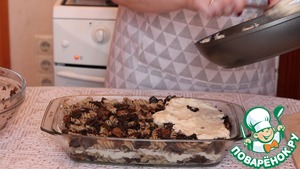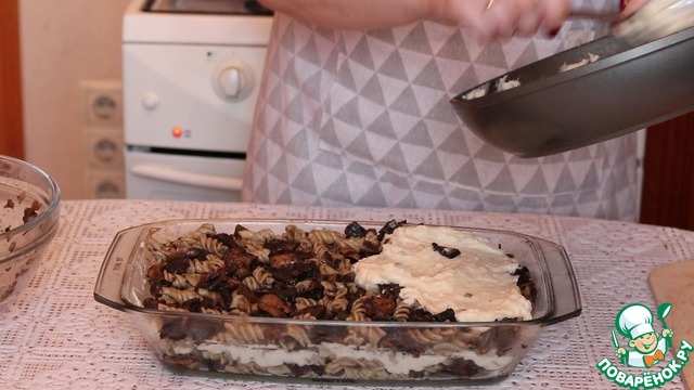 Форму для запекания смазываем растительным маслом и выкладываем половину макарон с грибами.