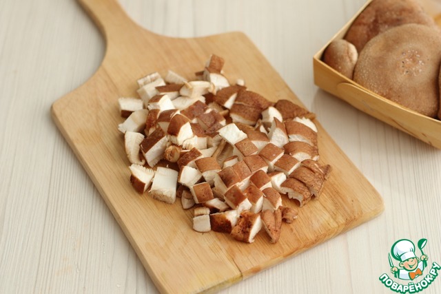 Грибы шиитаке нарезать крупными кубиками. Хочу сказать несколько слов по поводу грибов шиитаке. Если вы хотите приготовить по-настоящему вкусное и ароматное блюдо, не меняйте данный ингредиент на шампиньоны. Шампиньоны, на мой взгляд, в это блюдо не подходят. Количество грибов отрегулировать по своему вкусу.