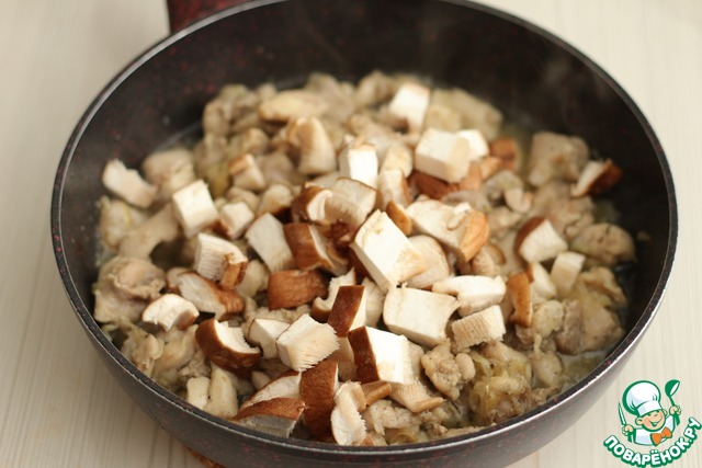 Далее добавить нарезанные кубиками грибы шиитаке. Обжарить, слегка перемешивая грибы вместе с филе курицы в течение 5-10 мин.