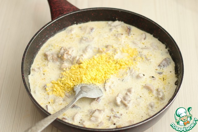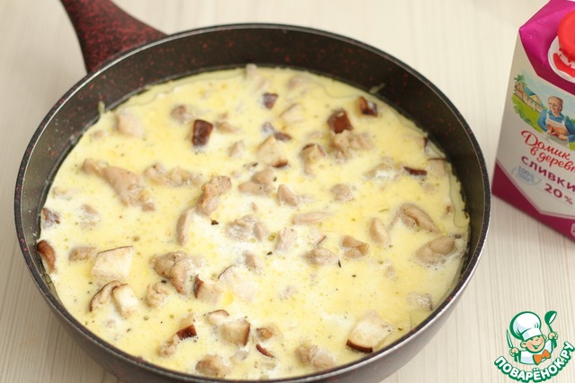 Далее добавить 450 мл. сливок жирностью от 10-20%. В данном рецепте использовались сливки жирностью 20%. Дать прокипеть на очень тихом огне в течение 5-10 мин.