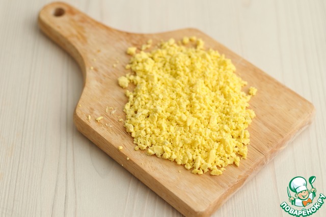 Яйца категории СО (2 шт.) отварить. Вынуть желток, порубить в мелкую крошку или натереть на терке.