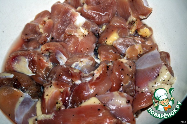 Куриное филе без кожи и куриную печенку нарезать небольшими кусочками,посолить, поперчить,перемешать и убрать в холодильник на несколько часов.Солите аккуратно,потому что соевый соус,который вы добавите потом соленый.
