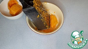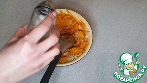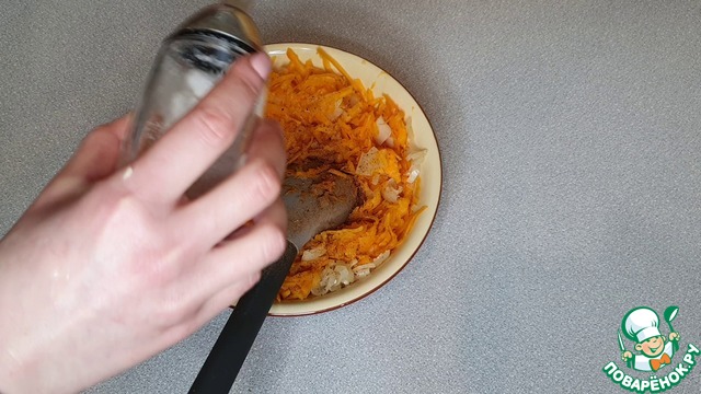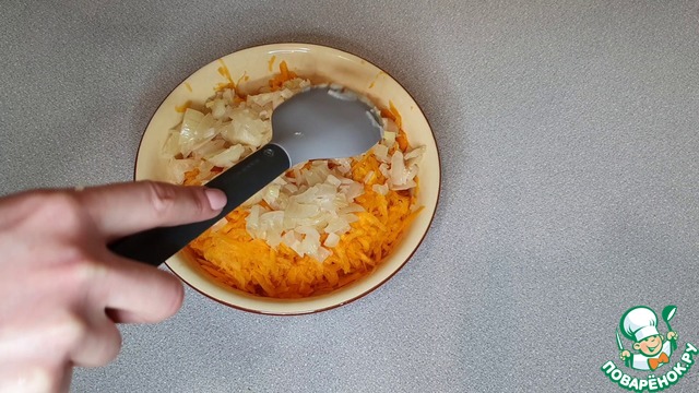 Добавляем обжаренный лук к натертой тыкве, перемешиваем