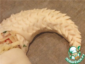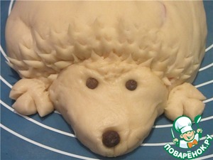 Пирог "Ёжик" - Из теста сформировать круг, края подровнять (обрезки для мордочки и лап). В центр круга выложить любую начинку, хорошо защипать края, придать форму шара и перевернуть швом вниз.