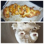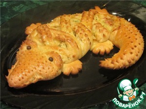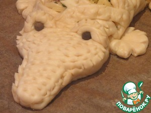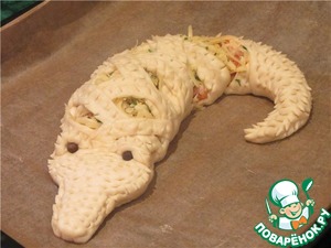 Перенести заготовку на противень застеленный бумагой для выпечки или фольгой. Ножницами сделать надрезы по всему туловищу.