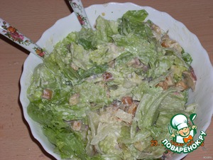 • Нарываем листья салата небольшими кусками. Все это перемешиваем в большой салатнице и в последнюю очередь добавляем сухарики и заправляем майонезом.